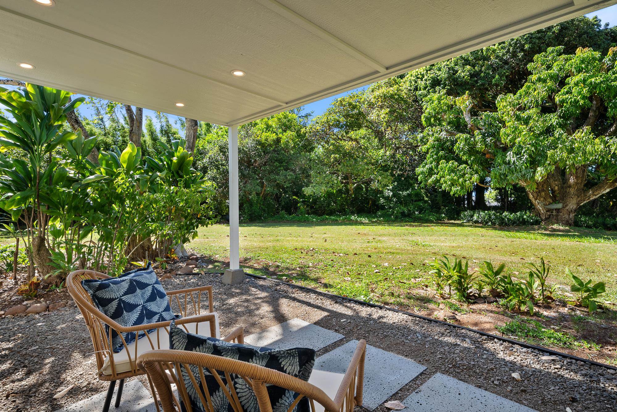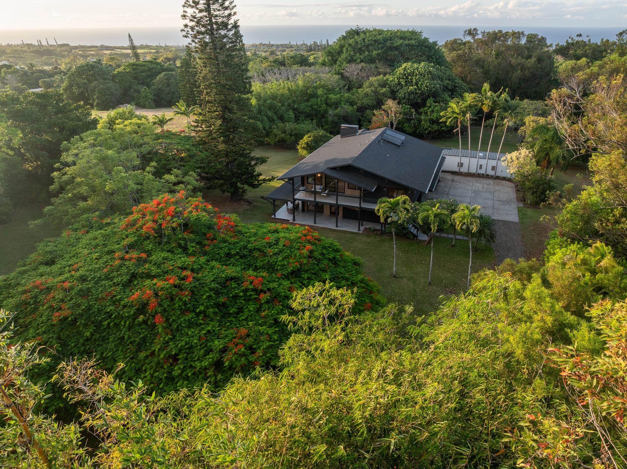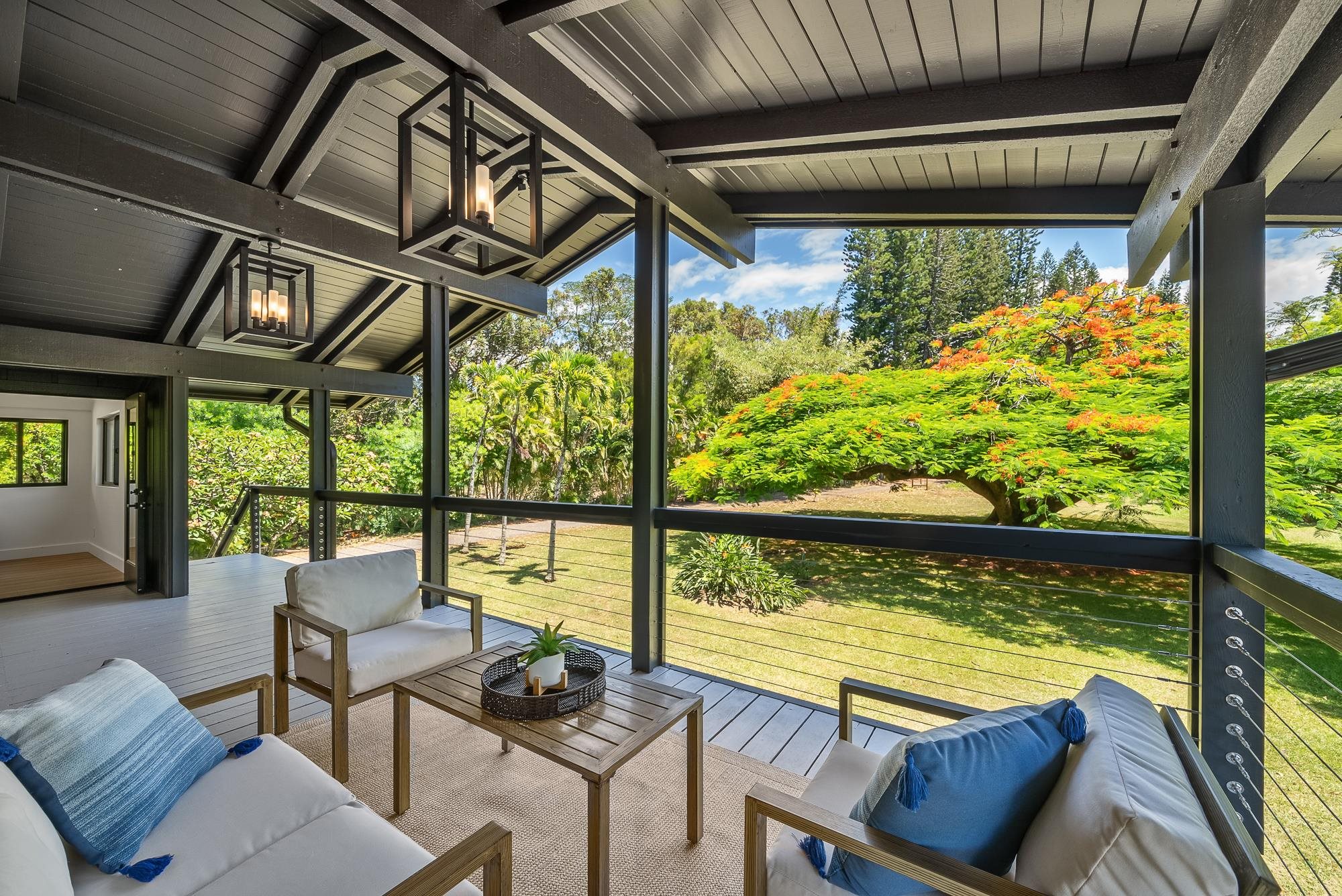 It's time for you to own your escape. Maui's North Shore is calling. Wake to the sound of the warm trade winds gently swaying the trees. Stroll in your expansive yard picking fresh fruit to complement your morning smoothie. Sit with your favorite book in your treehouse perched over a lush forest, dappled with sunshine. Catch a rainbow and end your day soaking in your outdoor bath, watching the sun set. Your idyllic Maui escape is ready: 965 Hog Back Road. At the end of a country road, tucked behind a majestic Royal Poinciana tree, sits a true North Shore treasure. Originally designed by renowned Maui architect Harry Rice and now reborn as a mid-century modern retreat, the home is elegantly enveloped by more than four acres of lush, private gardens. Light-filled living spaces open to expansive lanais and a spa-like outdoor bath featuring a 72" concrete soaking tub and custom shower. The gourmet kitchen boasts a 48" Hestan gas range, paneled Hestan refrigerator, European-style cabinetry, and a dedicated pantry/prep area. The 3,100 sq. ft. home features 3 spacious bedrooms, each with a luxurious ensuite bath, plus a separate upgraded cottage ideal for guests. A custom eucalyptus spiral staircase and handcrafted details throughout accentuate the classic Maui roots. Mature fruit trees, peaceful walking paths, and a treehouse overlooking the forested gulch create a private, retreat-like setting. All the home's amenities and features, accompanied with North Shore conveniences, make this a truly unique architectural treasure. This is an A unit of a CPR.